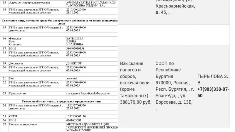 22 сентября управление федеральной налоговой службы по Бурятии добилось возбуждения исполнительного производства № 145101/25/98003-ИП. Объектом взыскания стал культурно-информационный центр (КИЦ) в посёлке Усть-Баргузине. Сумма долга перед бюджетом составила 388 тысяч рублей.