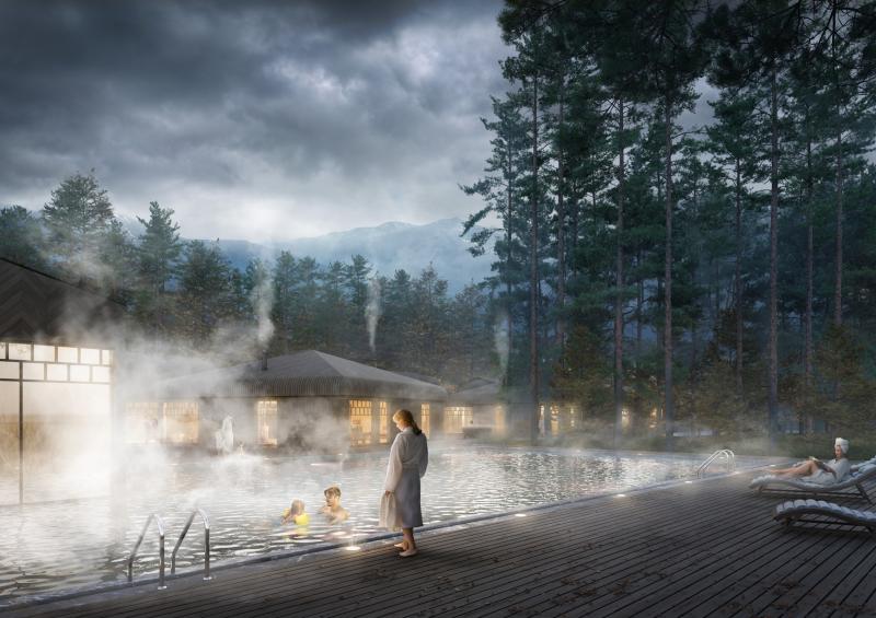 Рендер проекта туристического комплекса от MAD FOX architects с видом на акватермальный комплекс