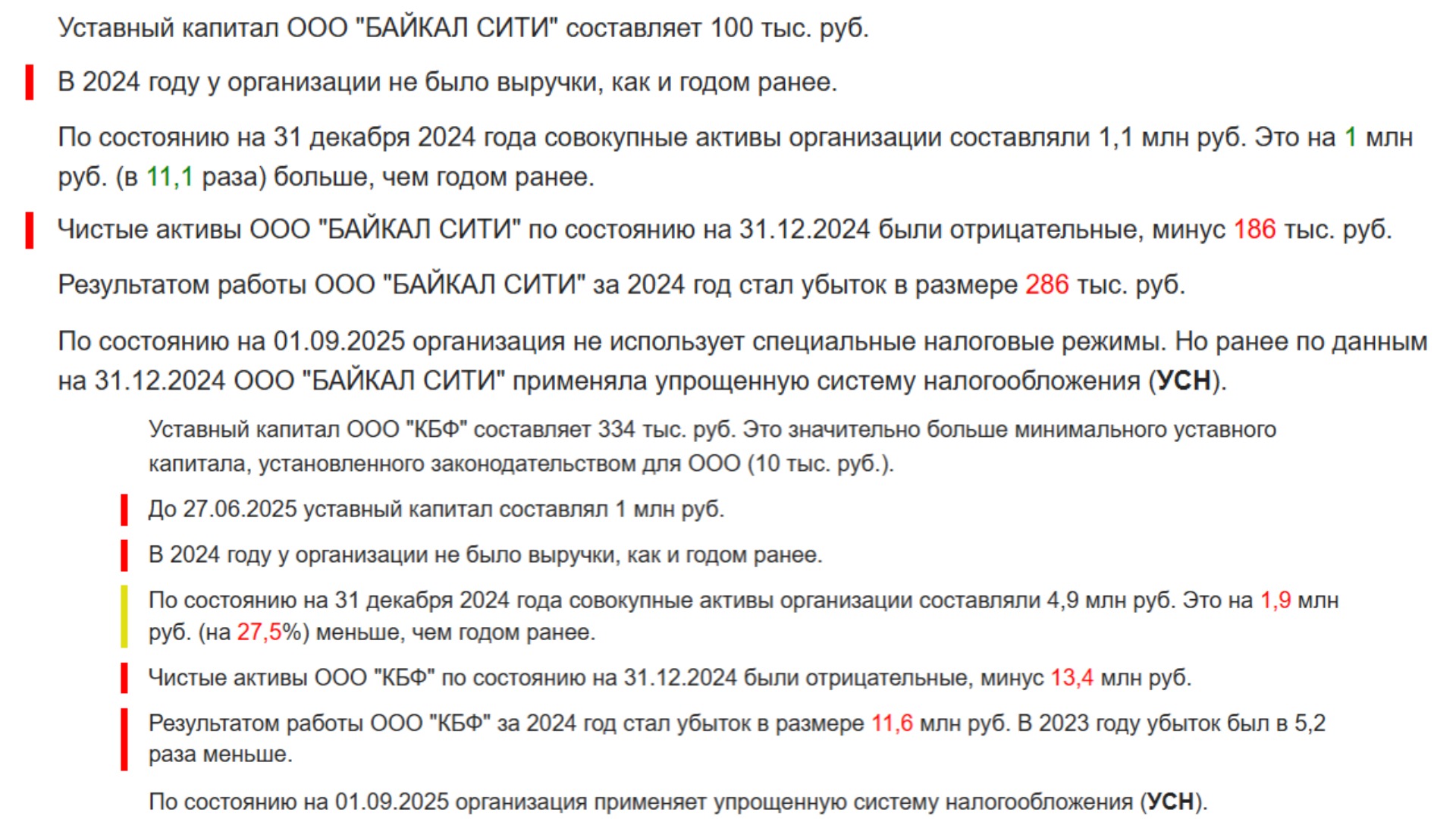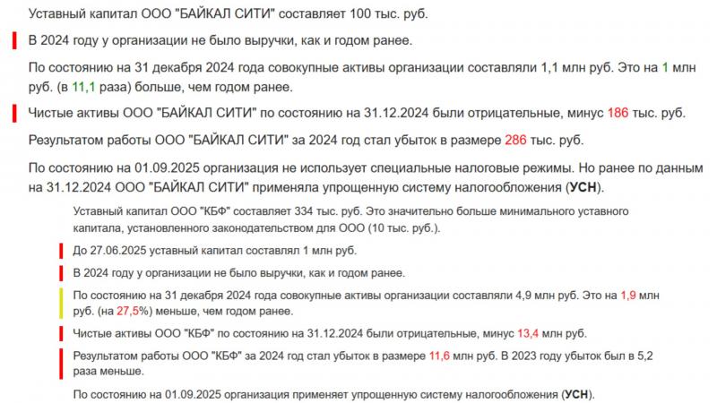 Московское ООО «КБФ» (ОГРН 1237700128027), которое стало новым владельцем «Байкал Сити», также не блещет успешной финансовой историей. Компания зарегистрирована в 2023 году. Её основной вид деятельности — консультирование по вопросам коммерческой деятельности. В 2023 и 2024 годах «КБФ» не имел выручки. Убыток за 2024 год достиг 11,6 миллиона рублей, что в 5,2 раза больше убытка предыдущего года. Чистые активы компании отрицательные: минус 13,4 миллиона рублей.